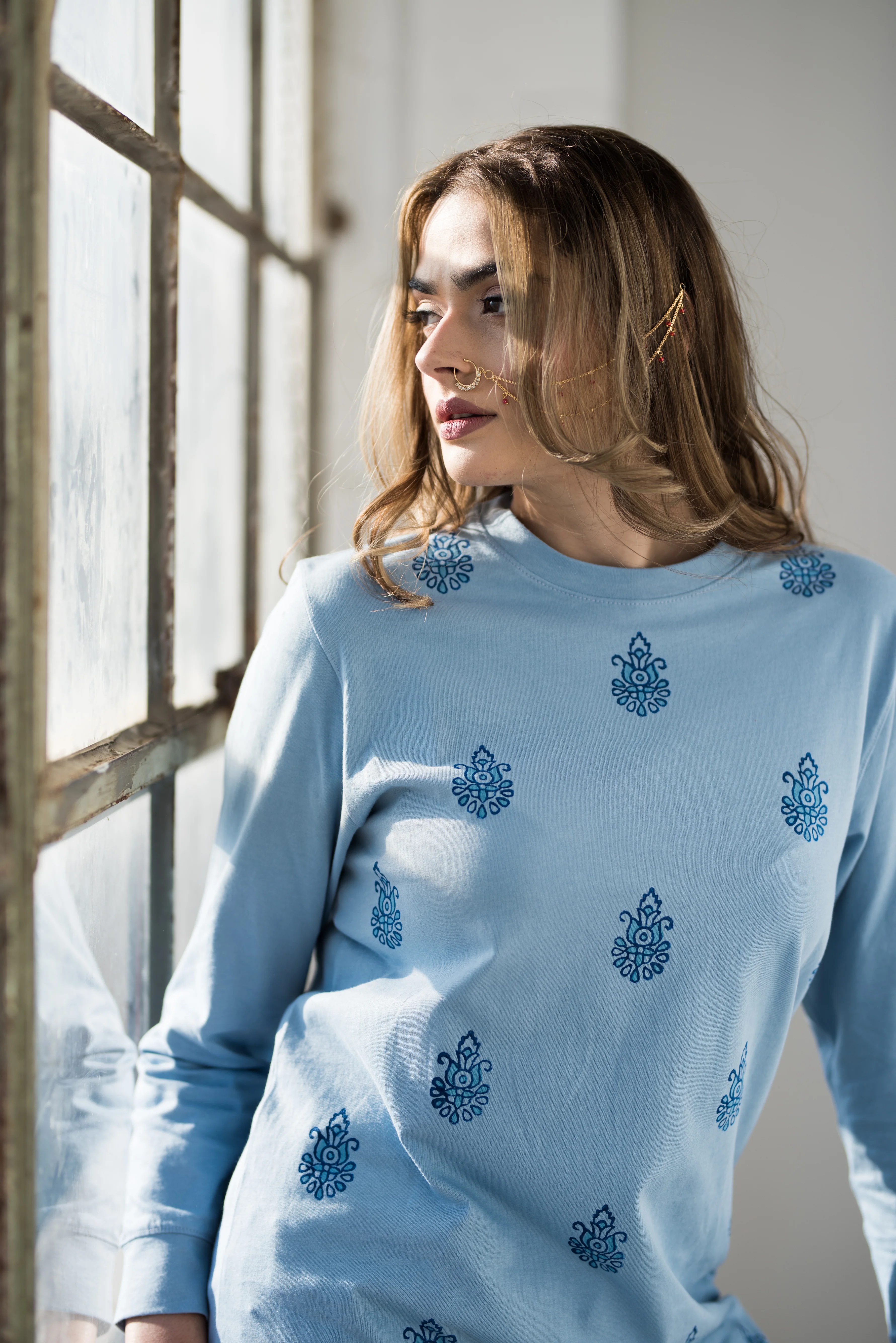 The Hawa Top has block print motifs done by skilled craftsmen using hand carved wooden blocks. Each piece is unique so the placement and colors might differ slightly.