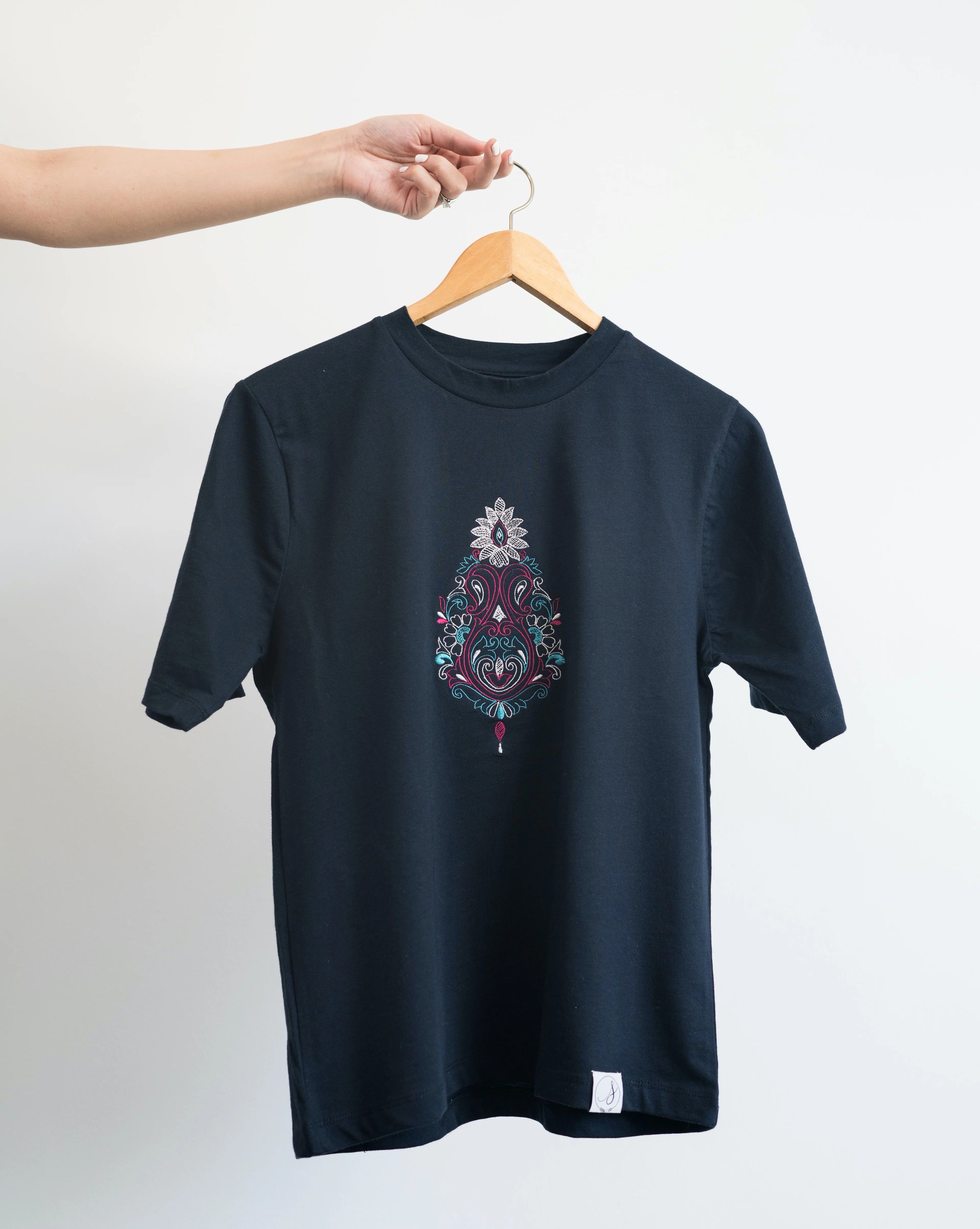 Chaand celebrates the beauty of the moon. The T-shirt is that perfect night time navy blue with a beautiful bold embroidered motif.
