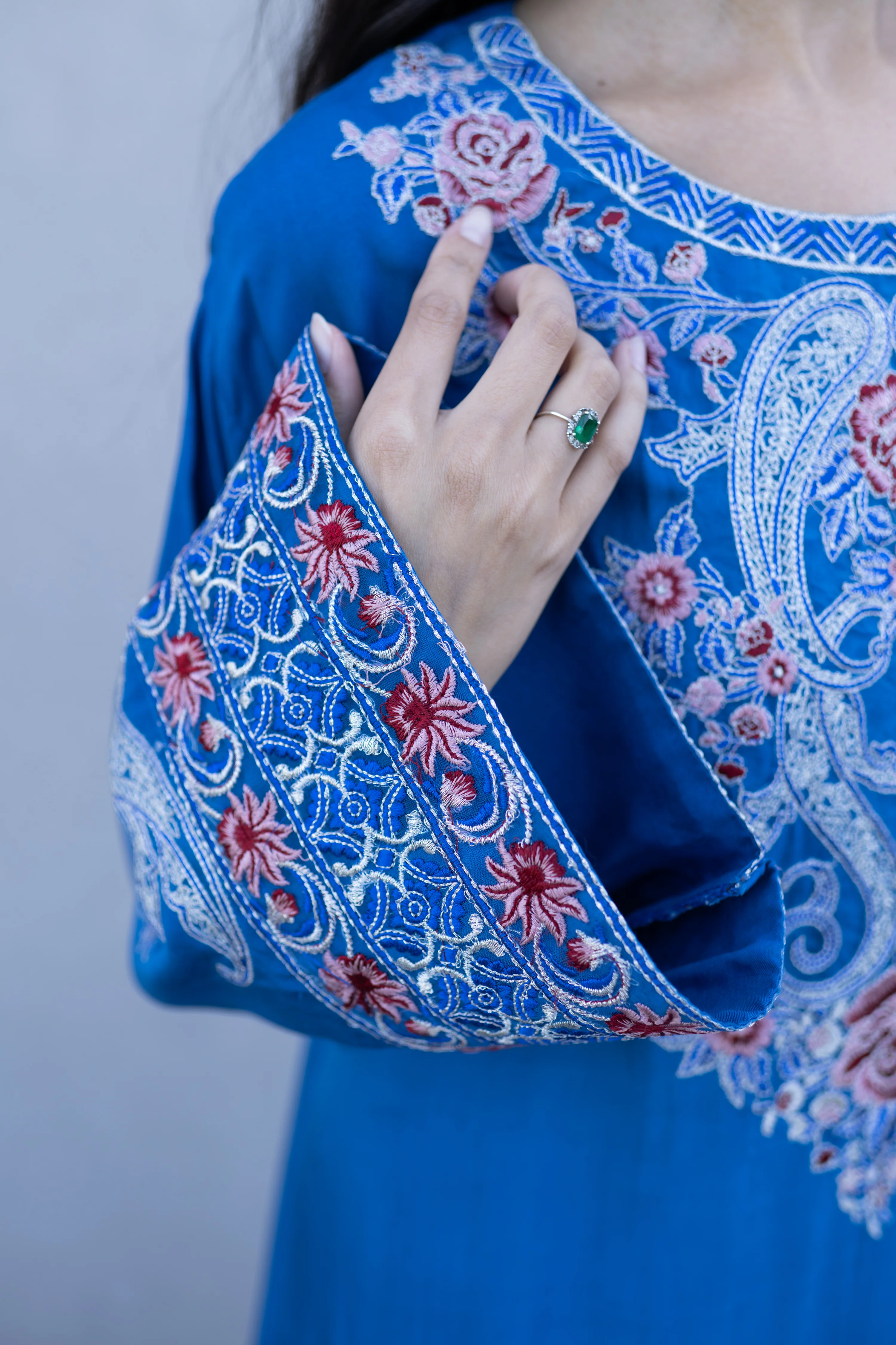 The Hadiya Kaftaan is made with pure viscose with beautiful embroidery on the front, sleeves and bottom of the back.