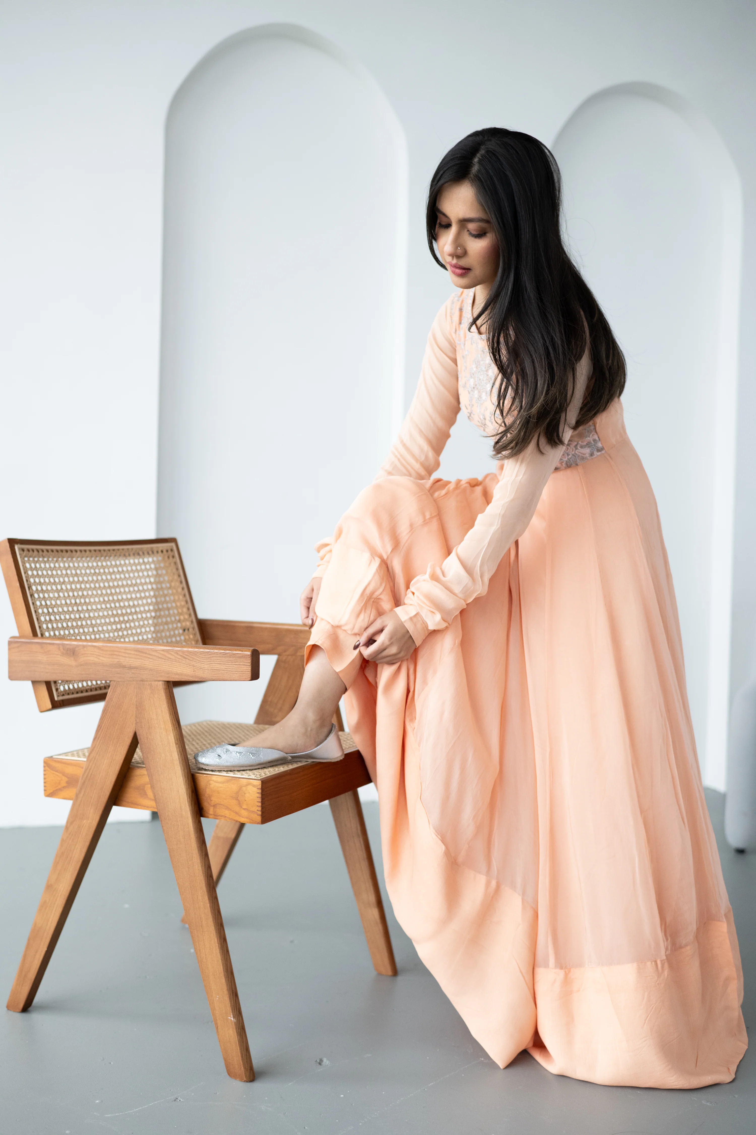 Hira is an elegant peach three-piece stitched suit with a flowing pure chiffon frock paired with raw silk pants and a pure khaddi net dupatta.Â