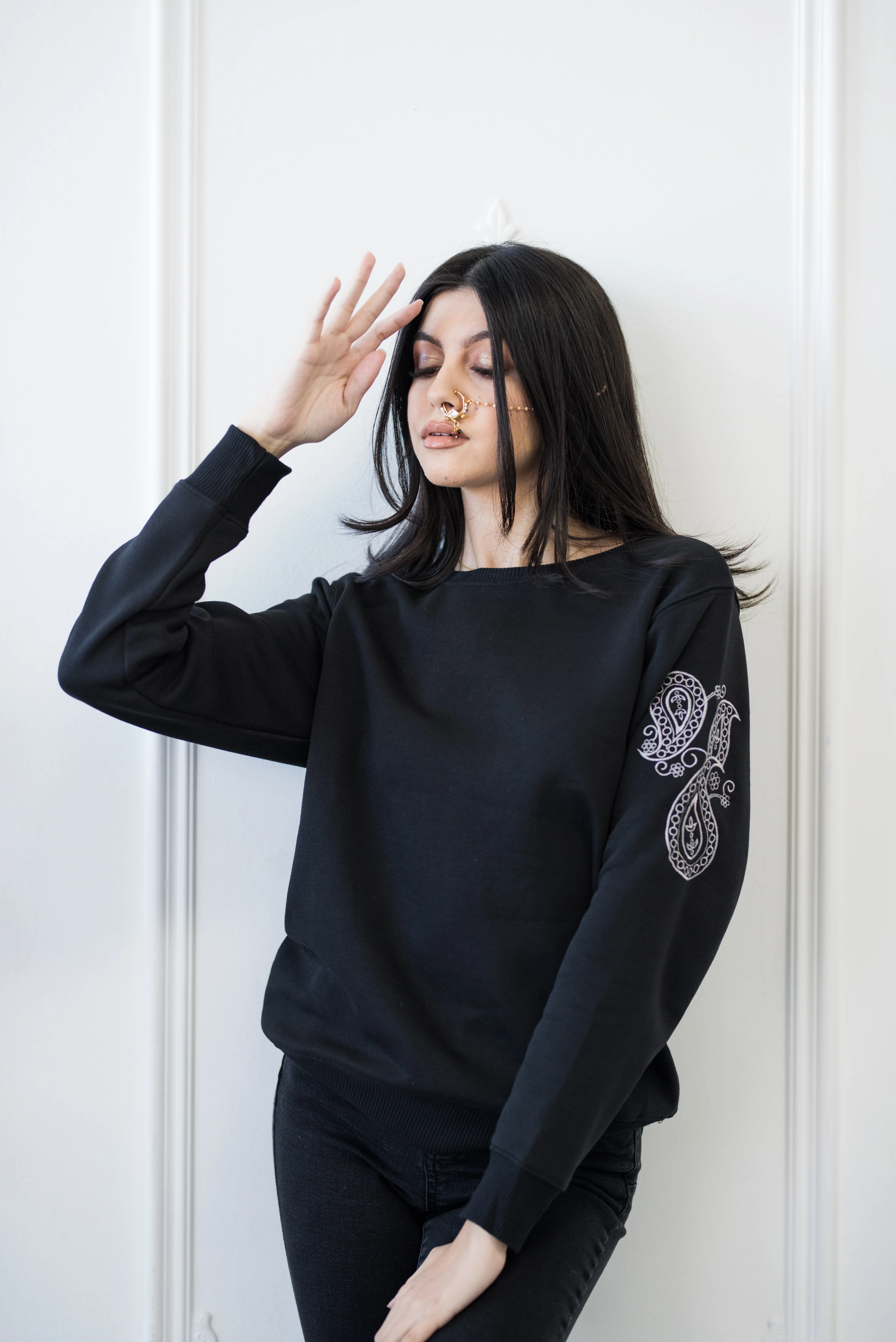 The Raat Sweat Shirt with an embroidered motif on it's sleeve is that perfect balance of comfort and style.