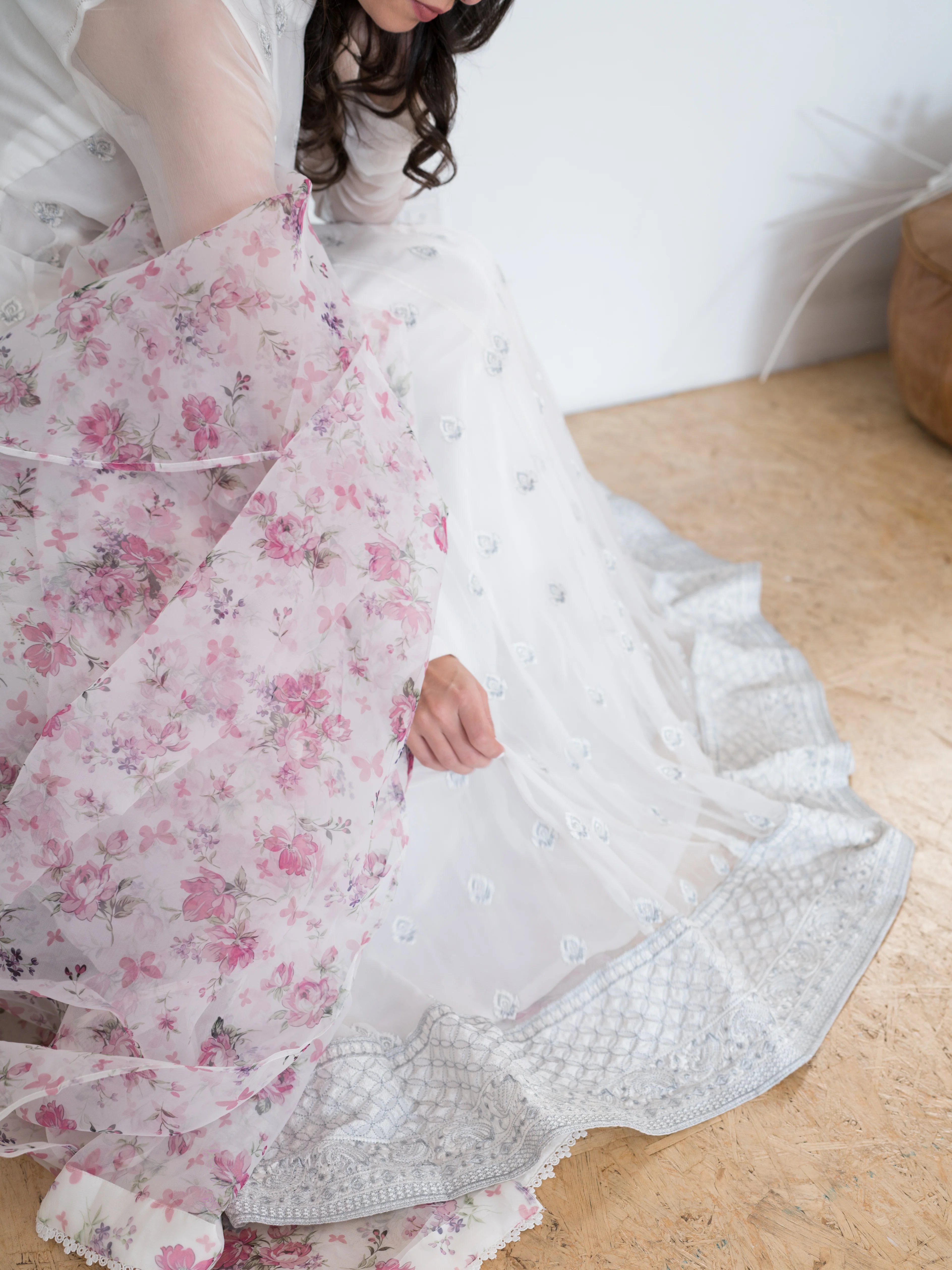 Sitara is an elegant white three-piece stitched suit with a flowing embroidered-chiffon frock paired with a floral organza dupatta and raw-silk pants.